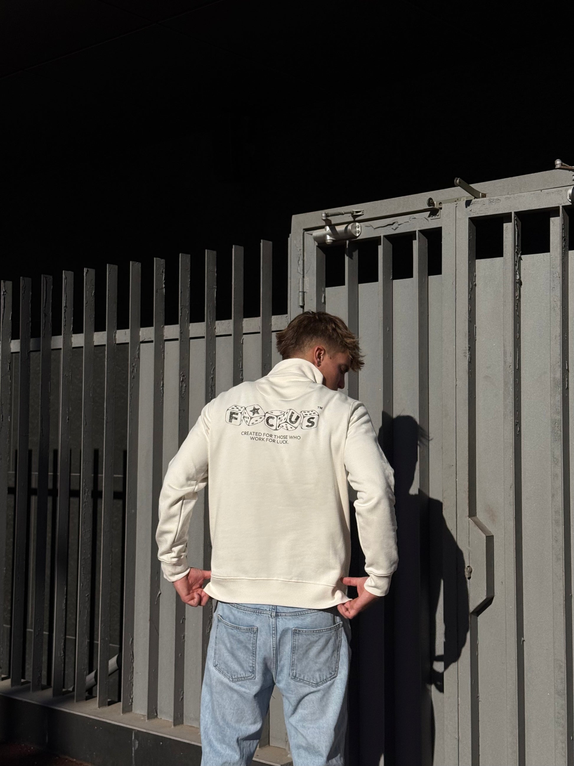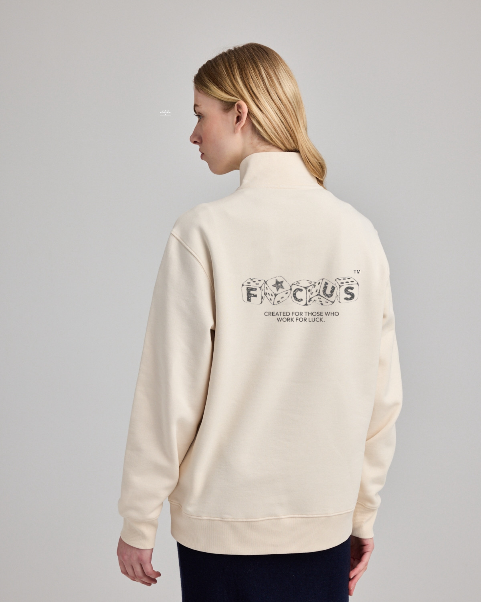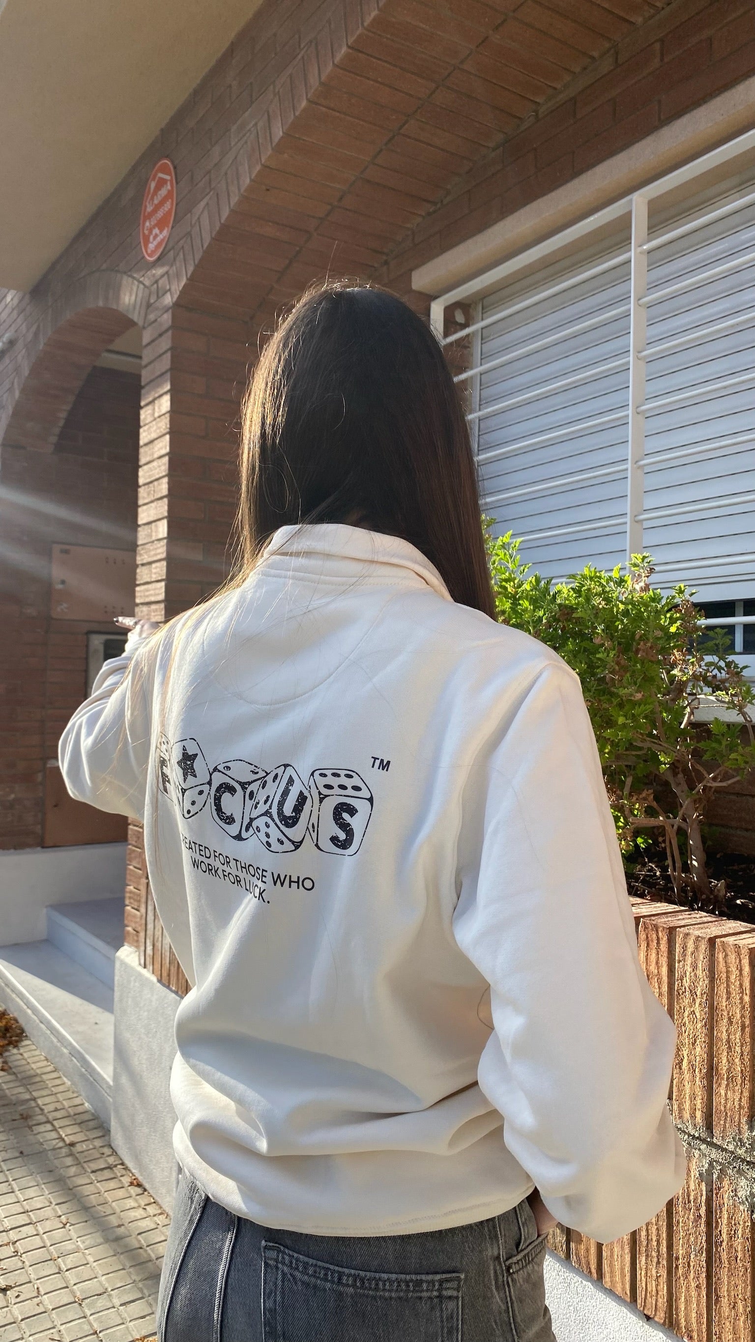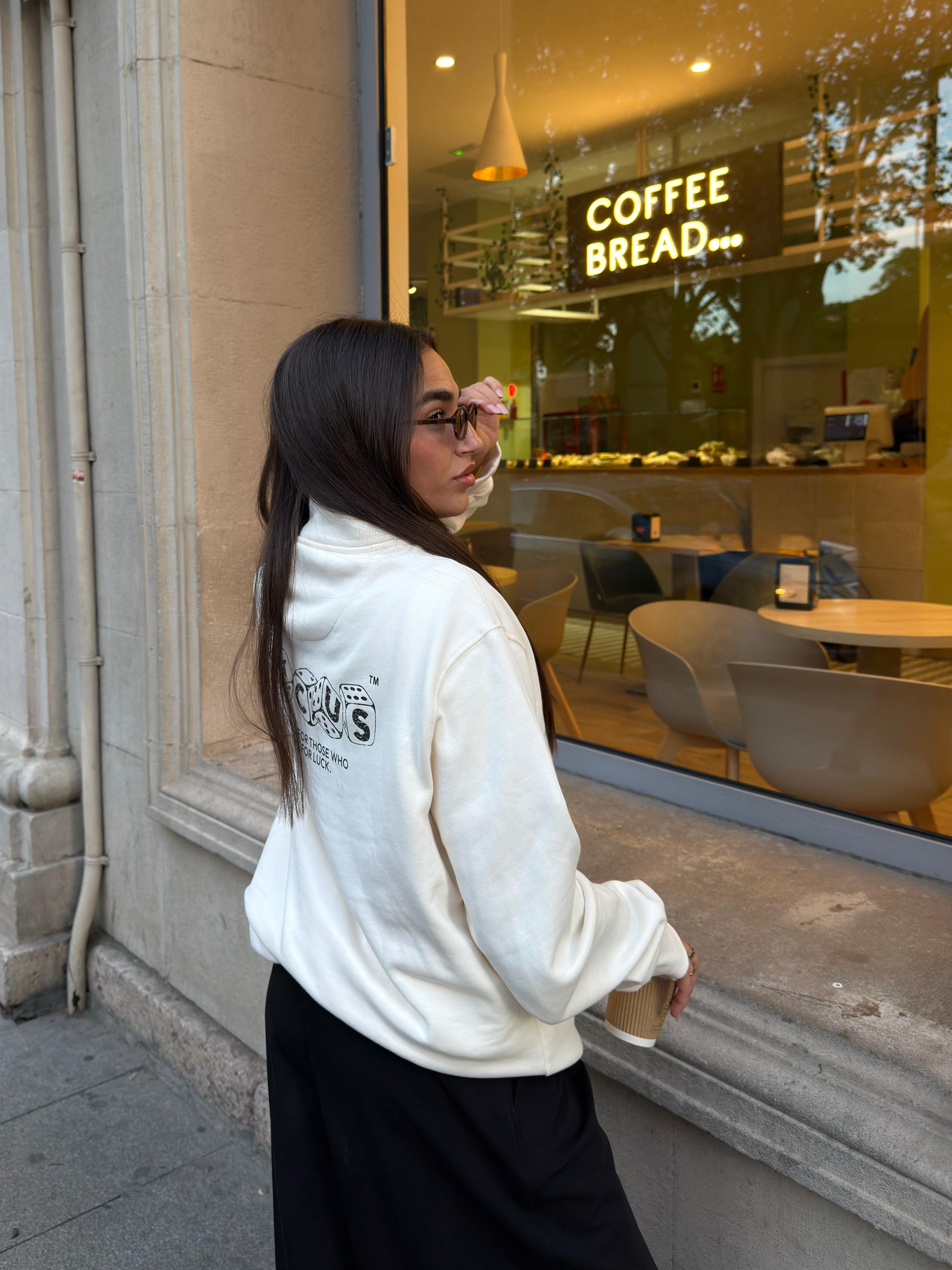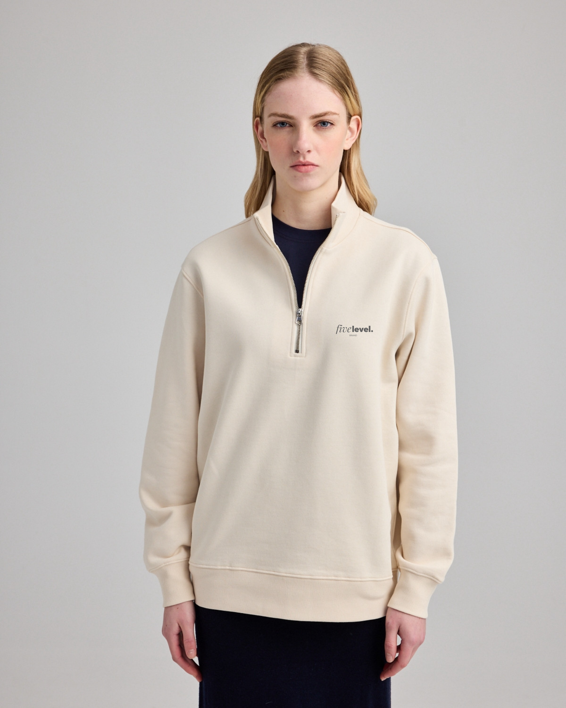 Detalles técnicos: Color blanco roto/beige claro. Media cremallera metálica. Cuello alto estructurado.
